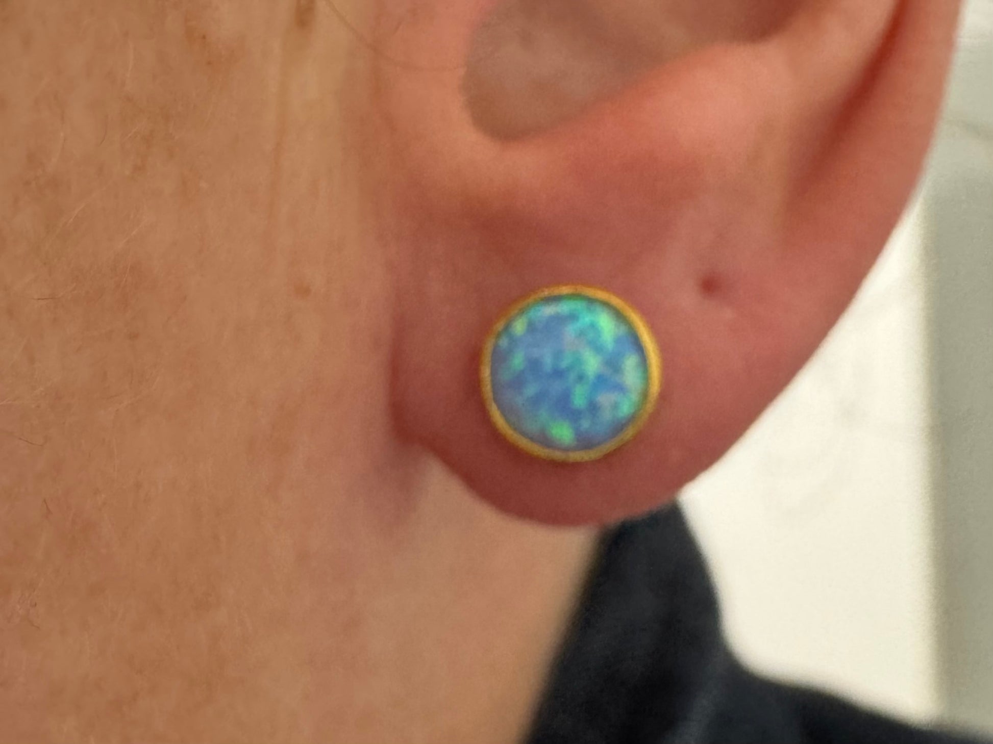 עגילי זהב צהוב 18 קראט, צמודים לאוזן, משובצים אבן אופל.